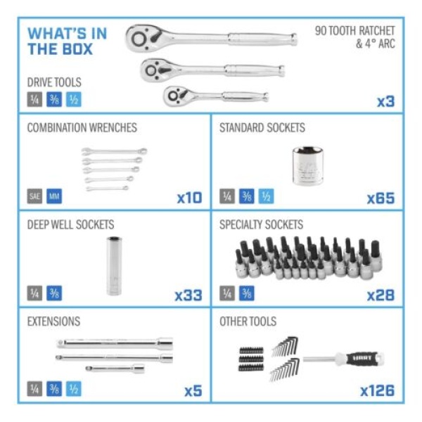 - It includes both Standard (SAE) and Metric (MM) sockets, as well as drive tools